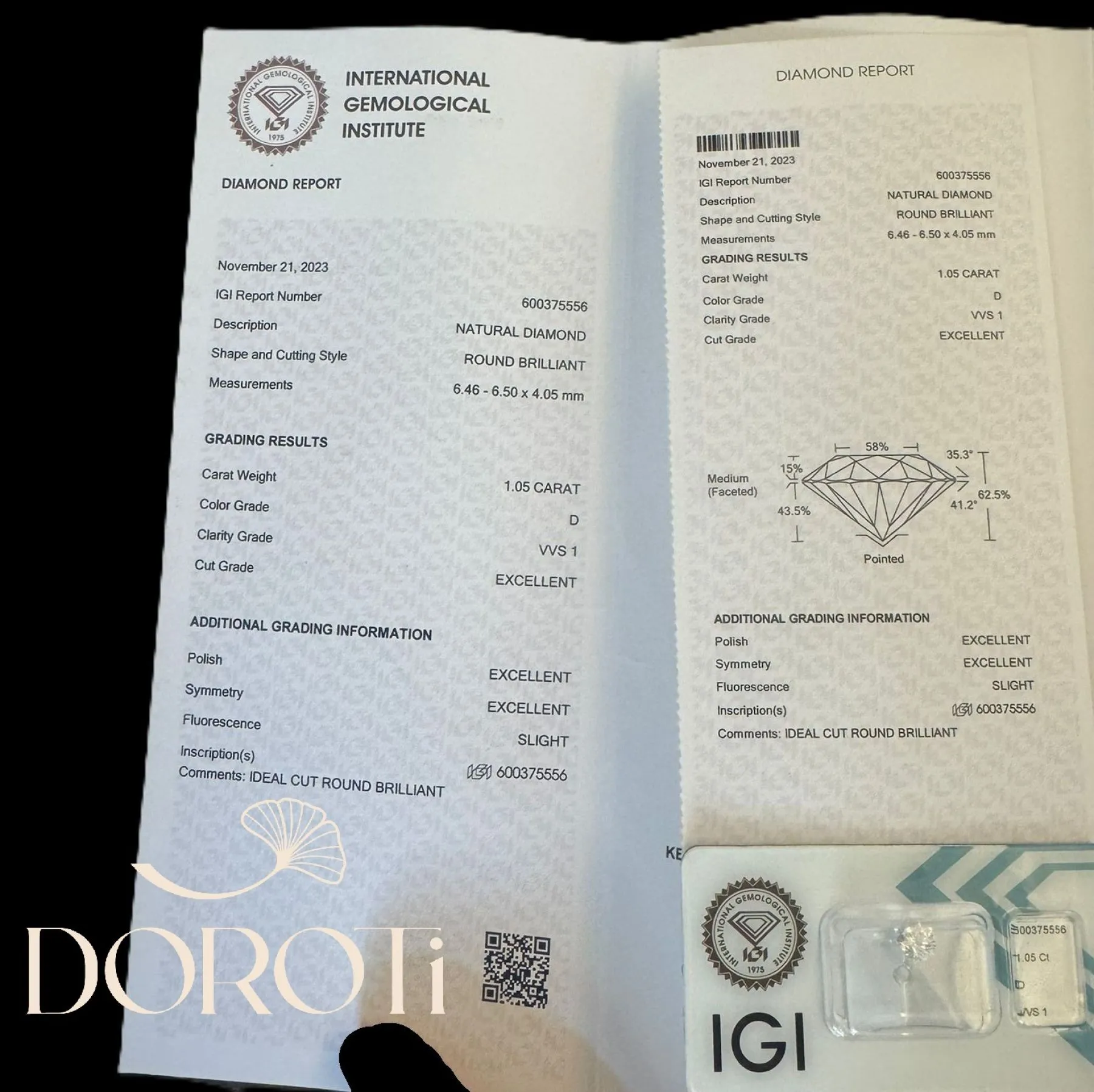 Diamante taglio brillante – 1.05 ct – Colore D – Purezza VVS1 – Taglio Excellent