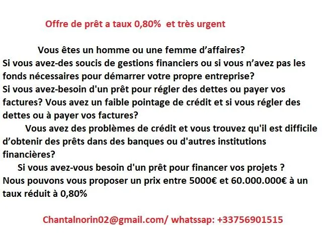 Vous êtes a la recherche de financement pour soit relancer vos activités soit pour la réalisation d'un projet ,soit pour vous acheter un appartement mais hélas la banque vous pose a des conditions dont vous êtes incapables de remplir.plus de souci moi je suis un particulier j’octroie des prêts allant de 1000 à 50.000 000 chf a toutes personnes capable de respecter ses engagements.par ailleurs le taux d’intérêt est de 0.80% à 3% l'an. soit vous avez besoin d'argent pour d'autres raisons ; n'hésitez pas de me contacter pour plus d'informations. : offre prêt argent sans frais site d annonce de prêt d argent en particulier en inscription offre de prêt particulier pour études particuliers sérieux français faisant prêts d argent annonces gratuites prêt entre particuliers site d annonce de prêt d argent entre particuliers les sites d annonces de prêt d argent petites annonces gratuites d offre de prêt entre particuliers crédit entre particulier recherche prêt d argent entre particuliers les sites d offre de prêt entre particulier offre de prêt particulier paris nouveau site d annonces de prêt d argent sans inscription particulier prête argent prêt sérieux entre particulier offre de prêt entre particulier France site d annonce gratuite français de prêt d argent prêt au particulier êtes ce sérieux nouveau site gratuit d offre de prêt au particulier site d annonce de prêt d argent 1 offre de prêt d'argent entre particuliers sérieux et honnêtes