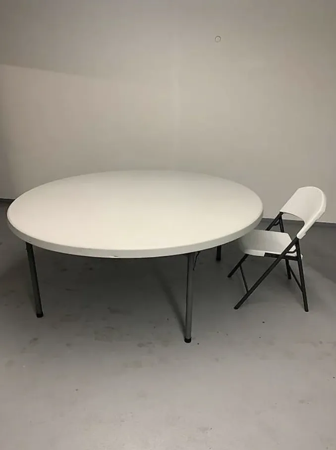 Vendesi 10 tavoli (diametro 1.80m) e 100 sedie pieghevoli, come nuovi per mancato uso. I tavoli sono sistemati su un apposito carrello che rende molto agevole gli spostamenti. La maggior parte delle sedie sono ancora imballate.