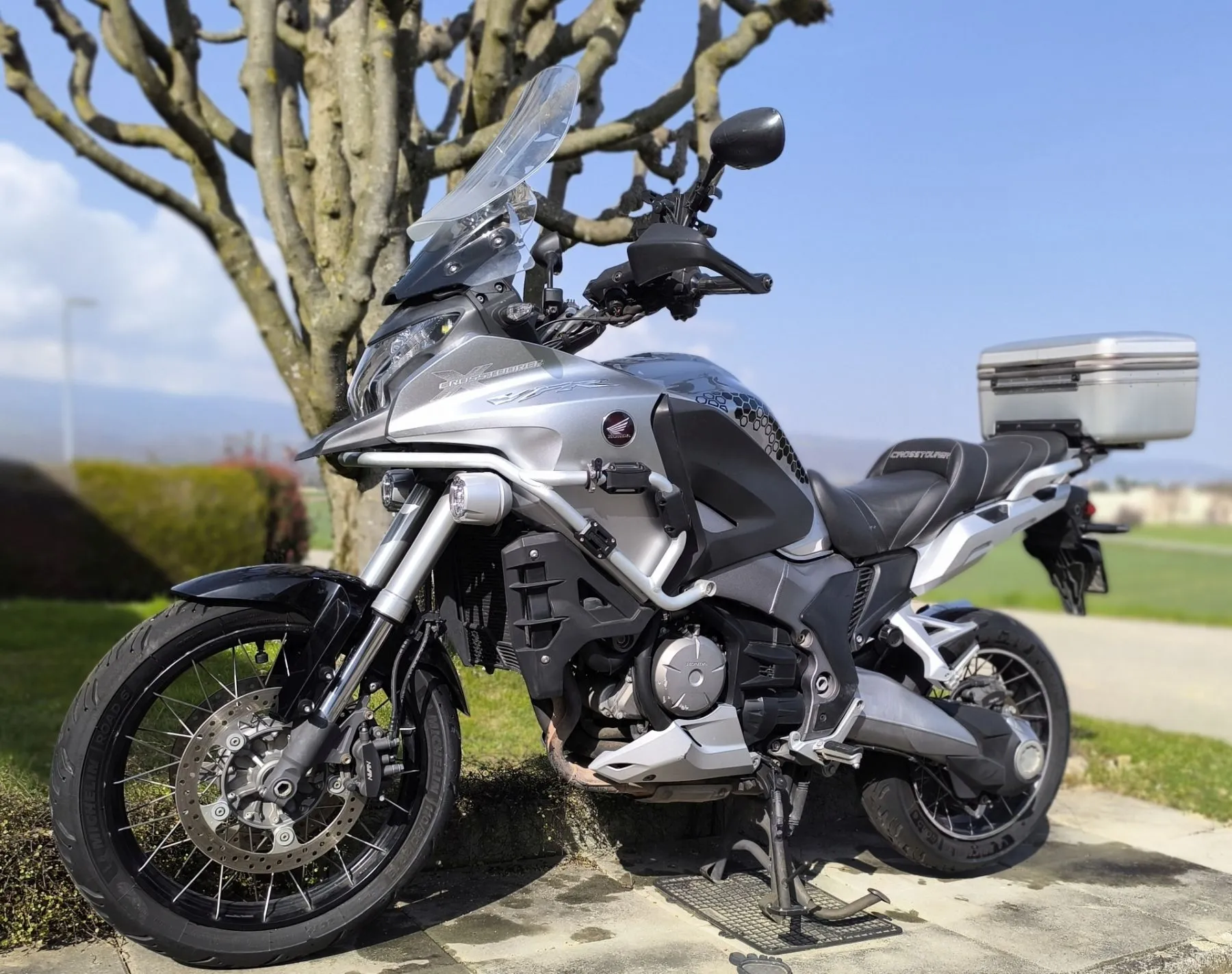 Équipée de poignées chauffantes, pare-brise réglable en hauteur, selle touring confortable, top case, valises latérales, feux antibrouillard, pare-chocs et divers accessoires pour plus de confort et de sécurité.