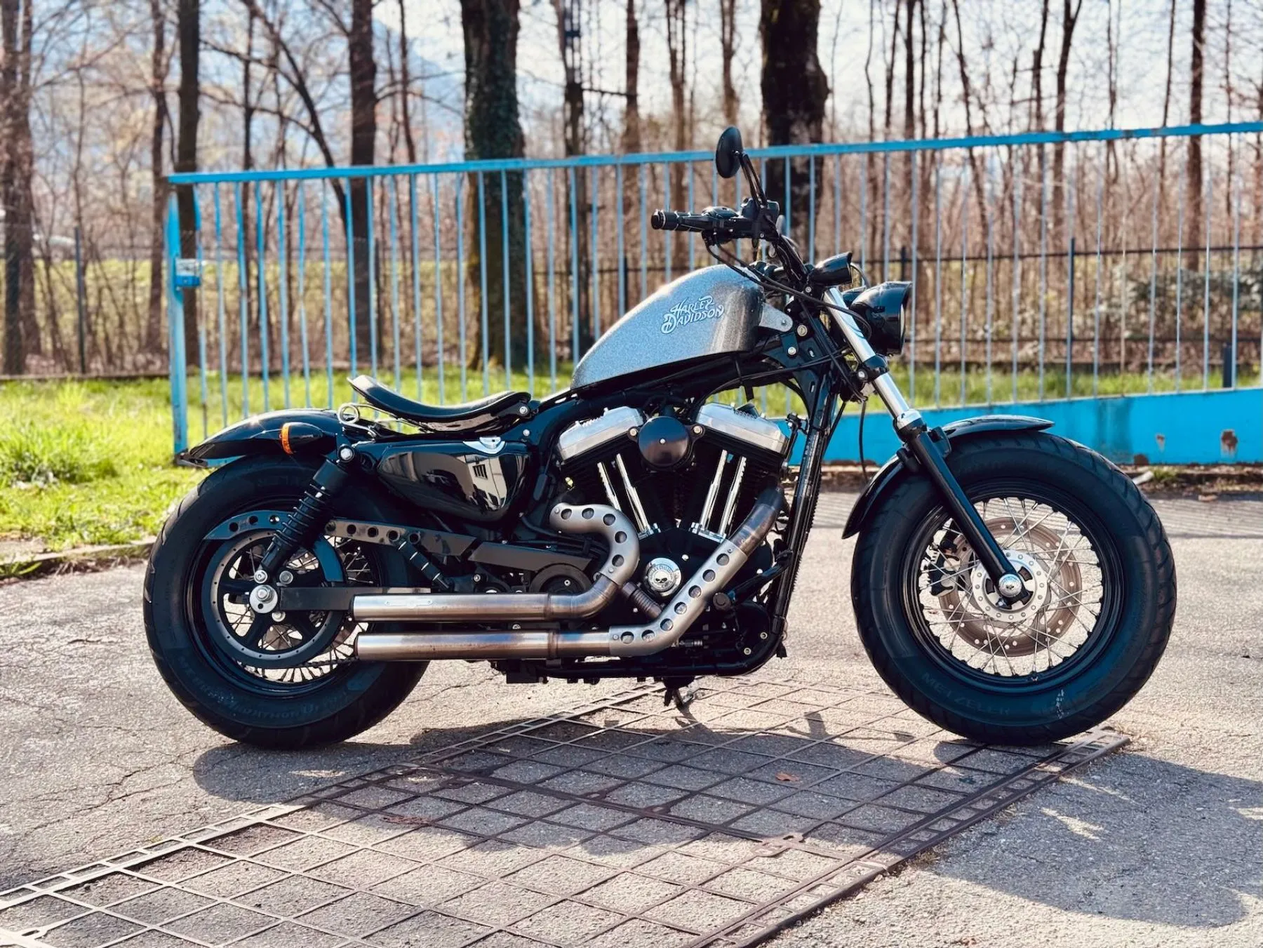 Il manubrio Hollywood definisce la posizione di guida, abbinato a un tachimetro Dakota Digital , mentre lo scarico BSL Outline offre il suono profondo che ci si aspetta da una Harley personalizzata.